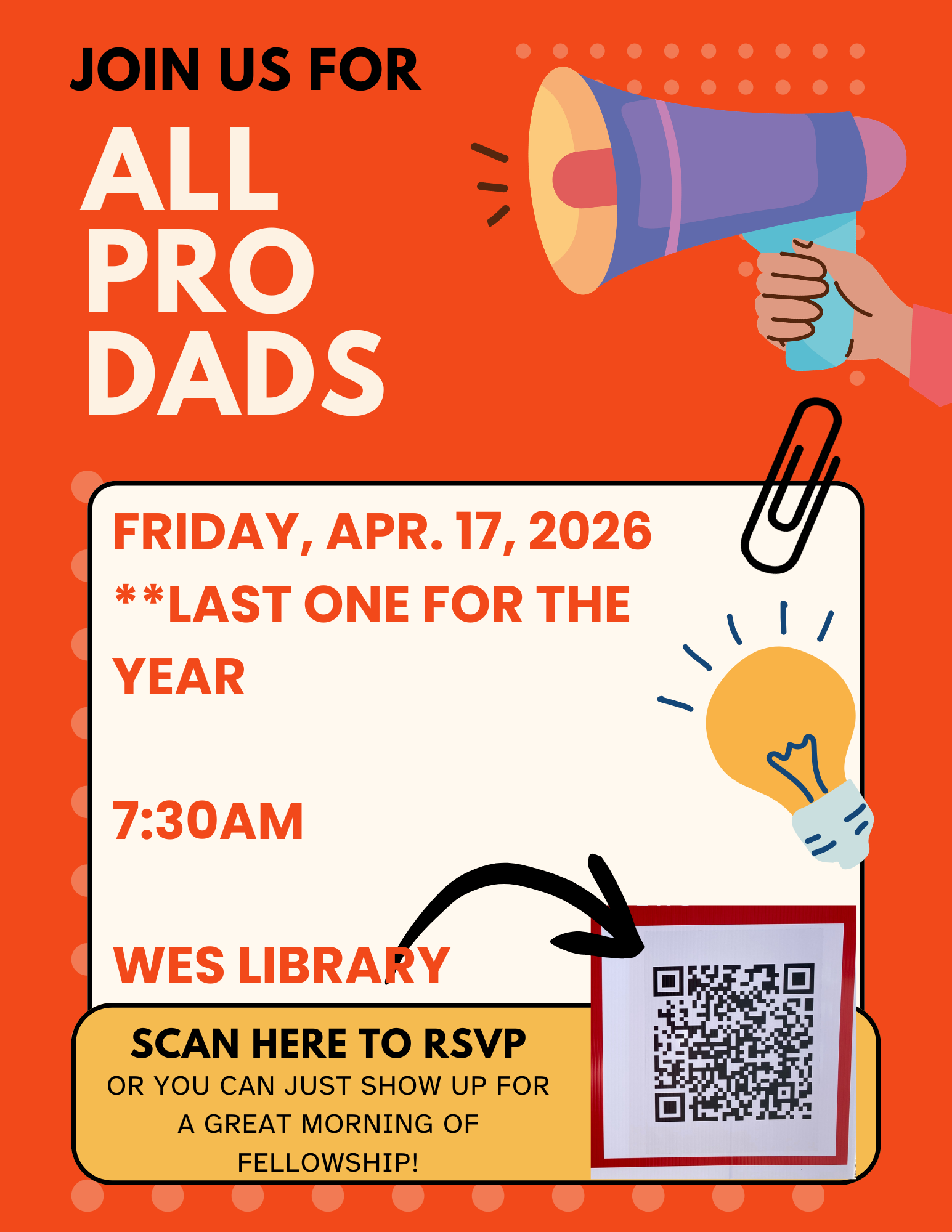 Please join us for our last All Pro Dads meeting for this year!!!Friday, Apr. 17, 2026 at 7:30am in the WES Library!